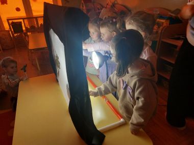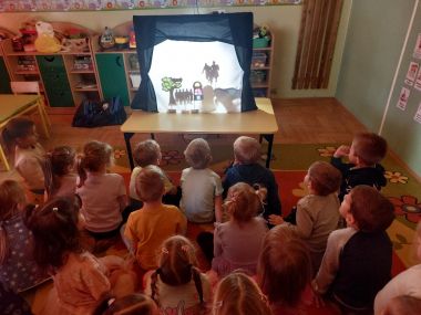 Była to wspaniała okazja, aby wprowadzić dzieci w magiczny świat teatru. Dzieci z dużym zaciekawieniem i w pełnym skupieniu obejrzały Legendę o Smoku Wawelskim oraz o Lechu, Czechu i Rusie. Rozmawialiśmy o teatrze cieni jako o wyjątkowej formie opowiadania historii – jak za pomocą światła i kształtu można tworzyć magiczne obrazy. Dowiedzieliśmy się, jak się tworzy cienie, następnie dzieci mogły same spróbować tej niezwykłej techniki. Na zakończenie każdy przedszkolak wykonał własne kukiełki do zabawy w teatr – był to twórczy i radosny czas, który z pewnością na długo pozostanie w pamięci dzieci.