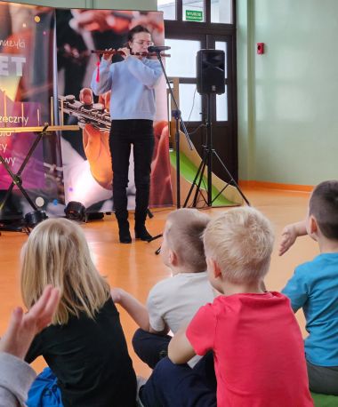 25 listopada nasze przedszkolaki ze wszystkich grup wiekowych wzięły udział w wyjątkowym koncercie muzycznym. Dzieci miały okazję zobaczyć różne rodzaje fletów, poznać ich brzmienie oraz dowiedzieć się, czym się od siebie różnią. Największą atrakcją była możliwość samodzielnego spróbowania gry na wybranych fletach. Przedszkolaki z radością tańczyły i śpiewały, słuchając piosenek z ich ulubionych bajek. Wspólna zabawa i muzyczne doświadczenia sprawiły dzieciom wiele radości i pozwoliły im odkrywać świat dźwięków w kreatywny sposób. To był pełen muzyki, ruchu i uśmiechu dzień!