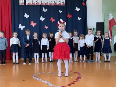 Z tej okazji wszystkie grupy zebrały się, aby uroczyście świętować ten wyjątkowy dla nas – Polaków dzień. Podczas występu, starsze dzieci recytowały wiersze patriotyczne opowiadające o historii Polski, oraz zaśpiewały patriotyczne piosenki o współczesnej polskości. Dzieci z wszystkich grup z dumą prezentowały przypięte biało – czerwone kotyliony. O godzinie 11.11 dumnie odśpiewaliśmy hymn Polski „Mazurek Dąbrowskiego” przyłączając się tym samym do placówek oświatowych z całej Polski. Ten dzień przeżyliśmy dumnie i z uśmiechem na twarzy, jak każdy patriota.