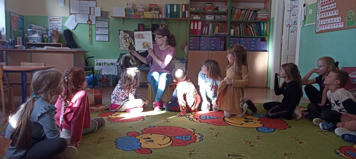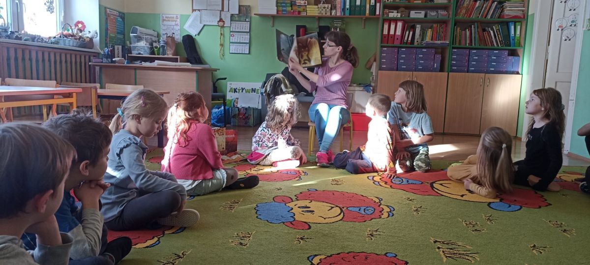 Zajęcia biblioteczne z Panią Natalią z Biblioteki Publicznej w Węgrzcach w ramach Dyskusyjnego Klubu Przedszkolaka.
