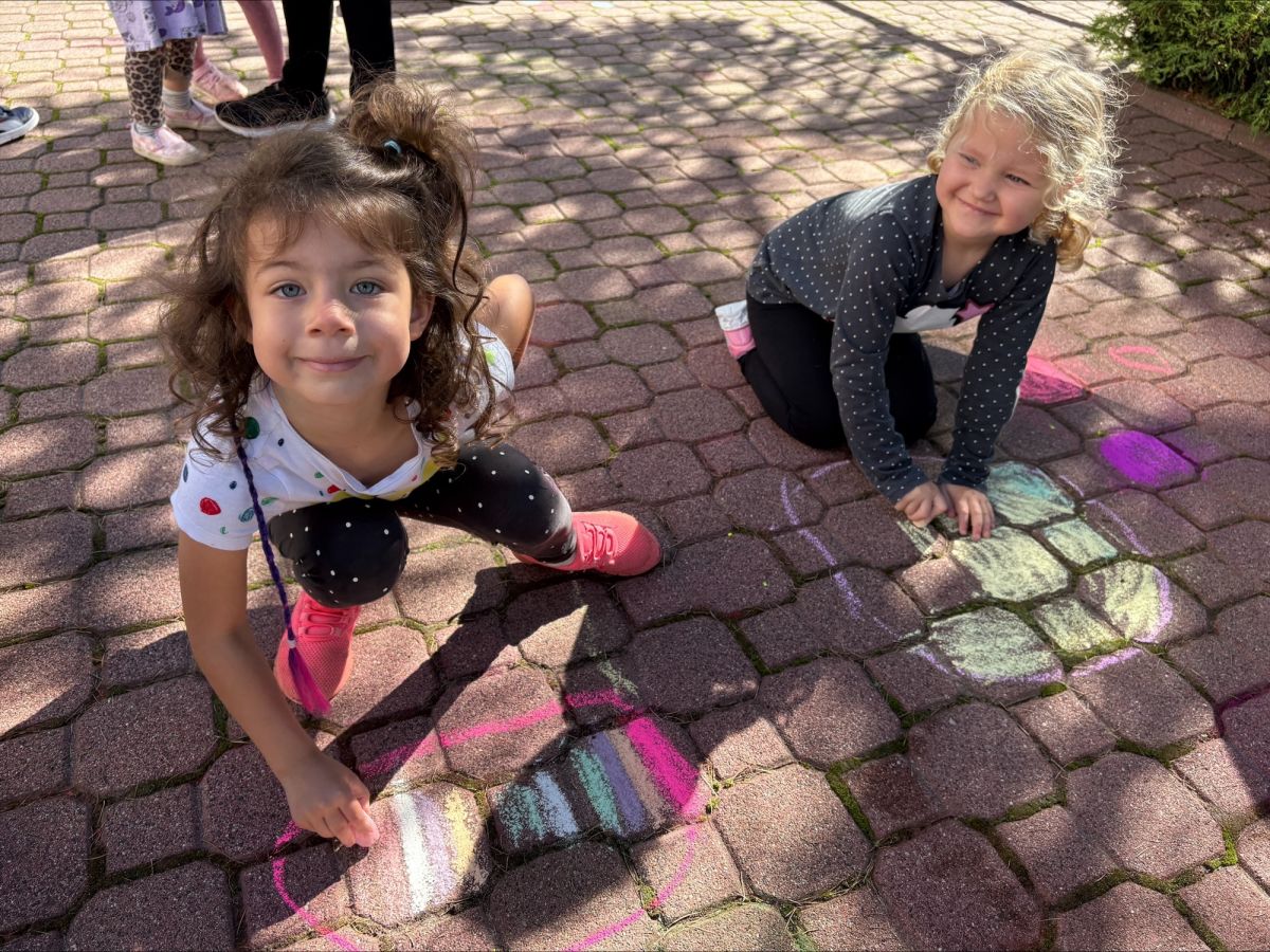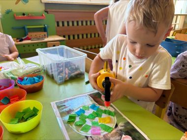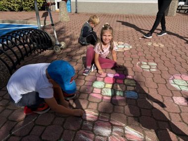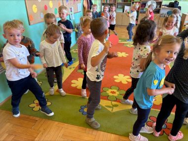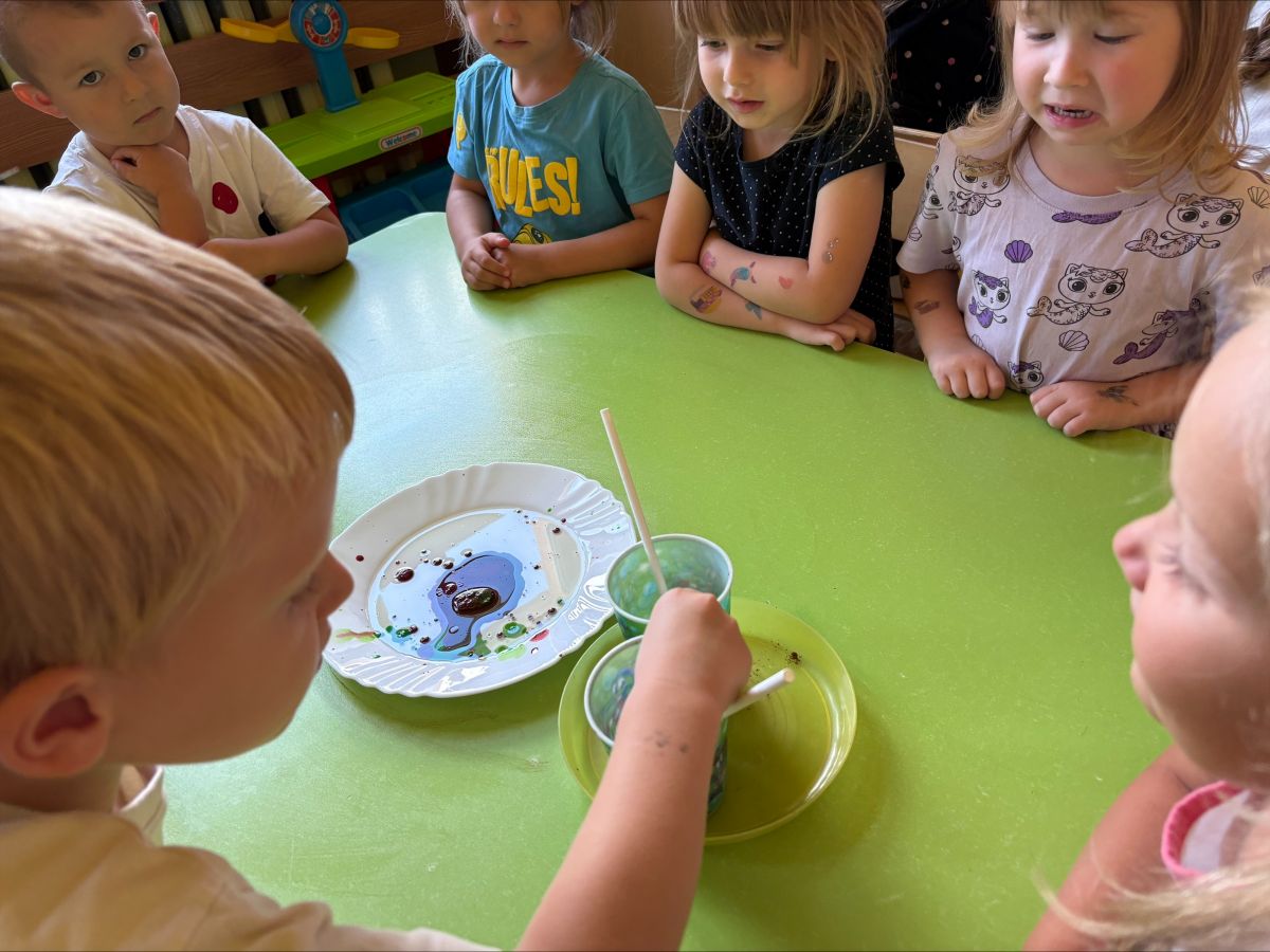 Przedszkolaki uczestniczyły w różnorodnych zajęciach ruchowych, rytmicznych i plastycznych z motywem kropki. Dzieci brały także udział w doświadczeniach z olejem i zabarwionym mlekiem. Stworzyły kolorowe prace - na chodniku przed przedszkolem i na papierze, a przy tym przekonały się, że nawet od jednej małej kropki może zacząć się wielka przygoda z wyobraźnią.