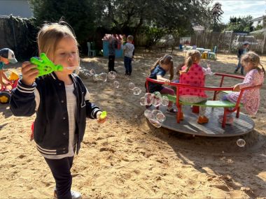 Z tej okazji na naszych przedszkolaków czekało wiele atrakcji – wspólne zabawy, tańce z balonami i gry z chustą animacyjną. Nasze dzieciaki puszczały i łapały bańki mydlane w ogrodzie przedszkolnym. Nie zabrakło również czegoś słodkiego, co sprawiło im wiele radości.