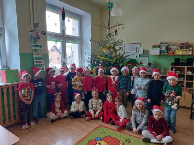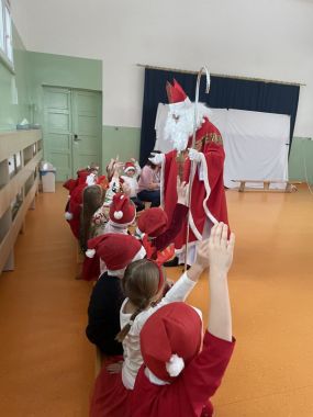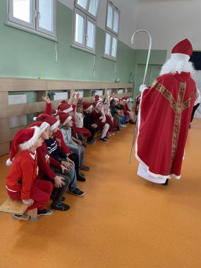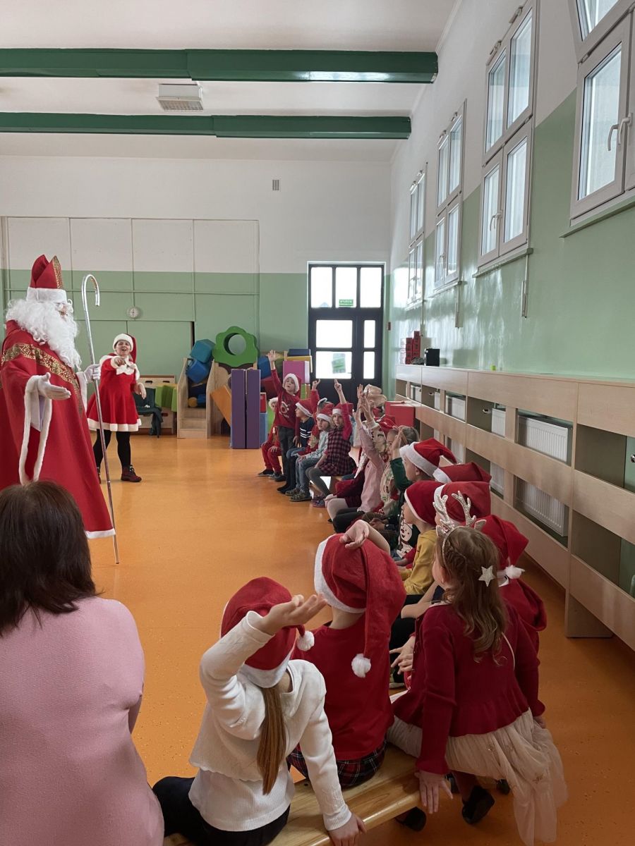 Tradycyjnie jak co roku 6 grudnia Przedszkolaków odwiedził Św. Mikołaj. Zanim jednak przy szedł dzieci wysłuchały opowieści o tradycji Mikołajek i o samym Mikołaju. Kiedy nieoczekiwanie dzieci usłyszały dźwięk dzwoneczków Mikołaja, Przedszkolaki od razu zaczęły podskakiwać z radości.