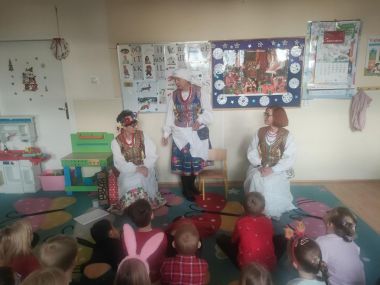 Panie opowiadały o elementach stroju krakowskiego, dzieci odszukiwały różnice w strojach, poznały kroki Krakowiaka, wykonały taniec do ludowych piosenek, poznały zwyczaje bożonarodzeniowe z Węgrzc, zakończeniem spotkania było ozdabianie cekinami gorsetu krakowianki. Bardzo dziękujemy za miłą współpracę.