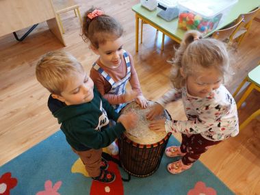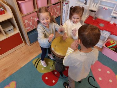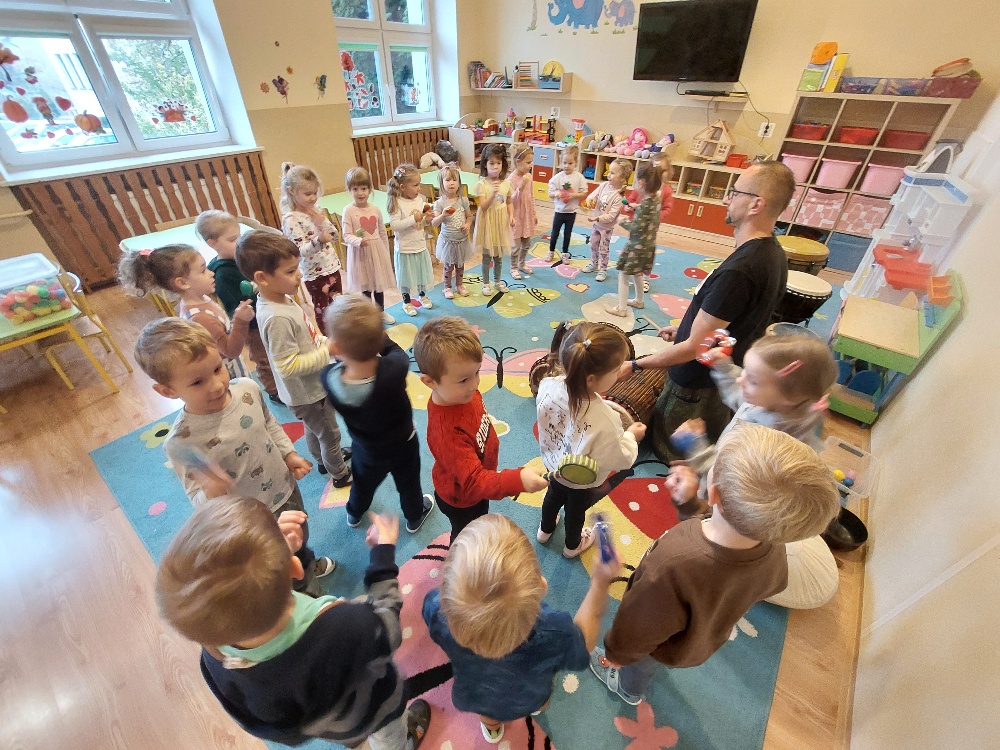 22 października w naszej grupie odbyły się warsztaty bębniarskie. Dzieci miały okazję zagrać na prawdziwych bębnach, uczyć się prostych rytmów, wspólnego grania, a nawet tańczenia. Na koniec zrobiły własne grzechotki, dzięki którym tworzyły własny mini koncert.