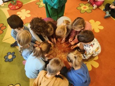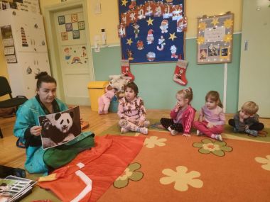 16 grudnia w naszej grupie gościliśmy panią Podróżniczkę, która opowiadała nam o chińskich wynalazkach: zapałki, lupa, papier, proch. Dzieci oglądały kokony jedwabnika, próbowały pałeczkami przenieść makaron do pudełka, a także mogły przebrać się w oryginalne chińskie stroje dziecięce.
