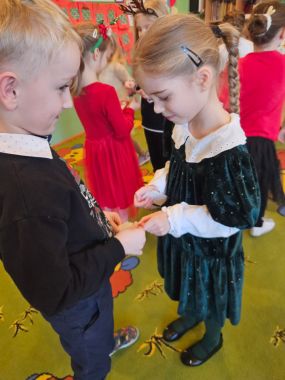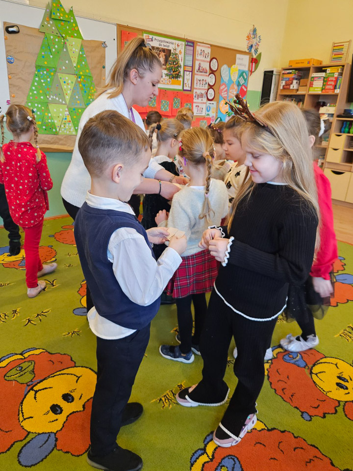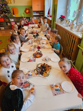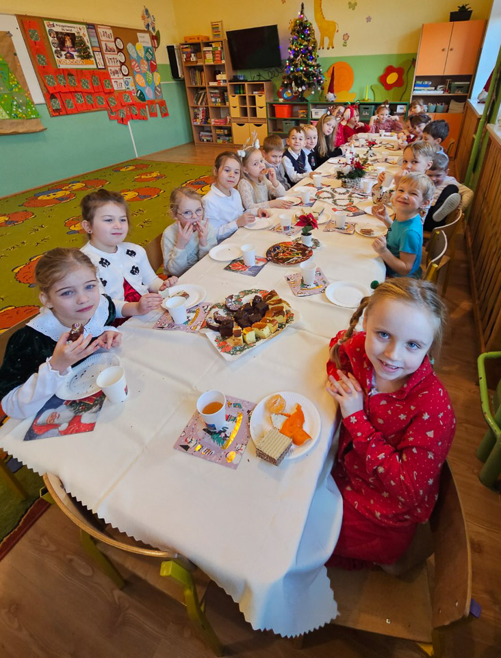 18 grudnia w Grupie VI odbyło się wyjątkowe spotkanie wigilijne. Dzieci wspólnie łamały się opłatkiem, składając sobie serdeczne życzenia. Na stołach pojawił się przepyszny poczęstunek przygotowany przez Rodziców, za co serdecznie dziękujemy. Towarzyszyło nam wspólne kolędowanie, miła i ciepła atmosfera oraz eleganckie, świąteczne stroje. Były to cudowne, pełne radości i magii świąt chwile, które na długo pozostaną w naszej pamięci.