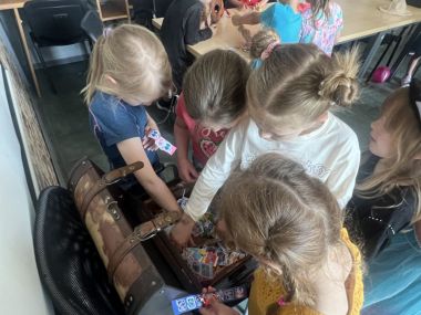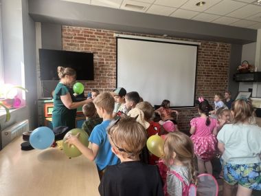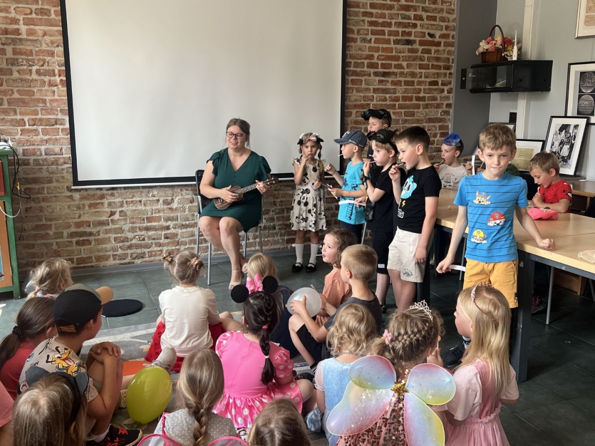Nie zabrakło też zabawy – dzieci uczestniczyły w balonowym konkursie przypominającym podchody, który zakończył się odnalezieniem kufra pełnego słodyczy i naklejek. Była też muzyka i taniec i śpiew przy dźwięku ukulele. Po wszystkim ruszyliśmy na plac zabaw przy ulicy Spacerowej, a potem – zmęczeni, ale szczęśliwi – wróciliśmy do przedszkola.