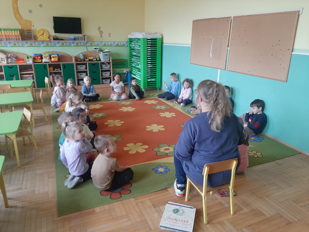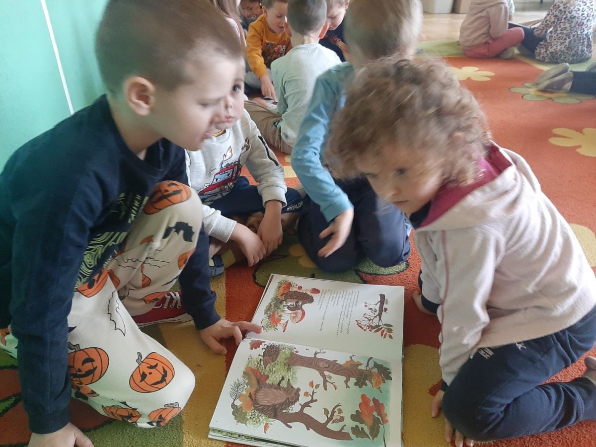 W ramach współpracy z bibliotekami w naszej gminie przedszkolaki uczestniczyły po raz kolejny w zajęciach prowadzonych przez Panią z Biblioteki Publicznej w Bibicach. Pani tym razem zaprosiła przedszkolaki do wysłuchania książki pt. ”Wiewiórki, które nie chciały się dzielić” oraz do wykonania pracy plastycznej „Las”.