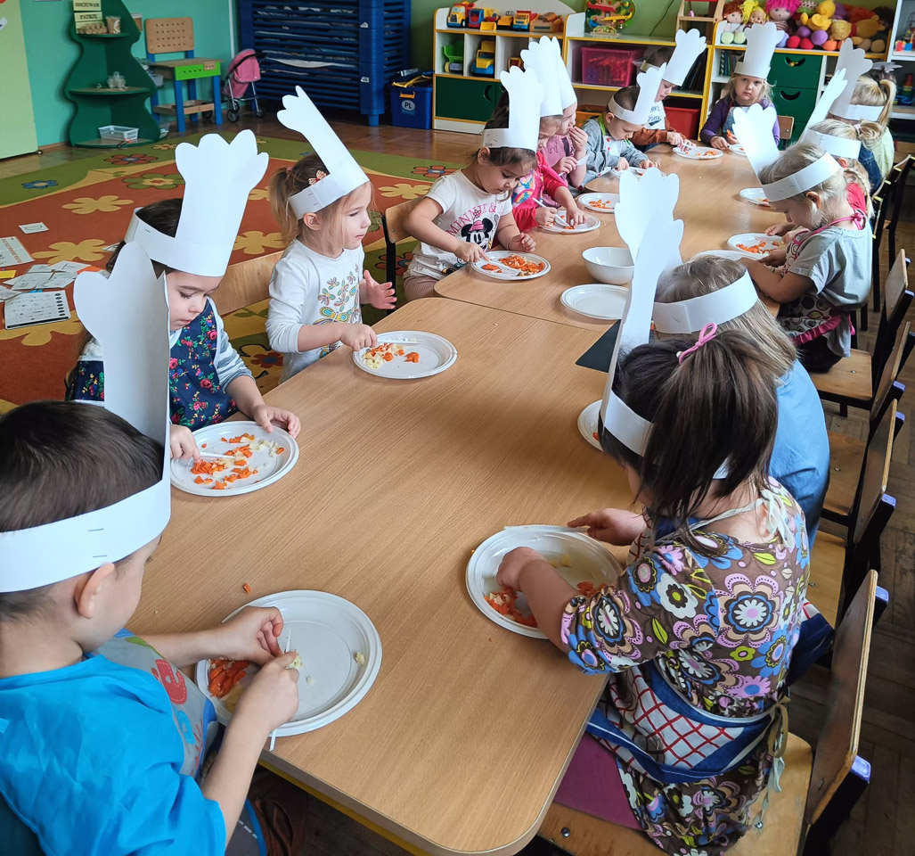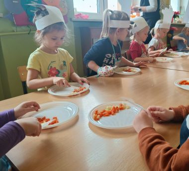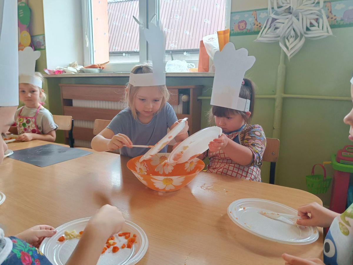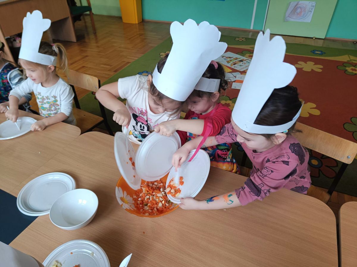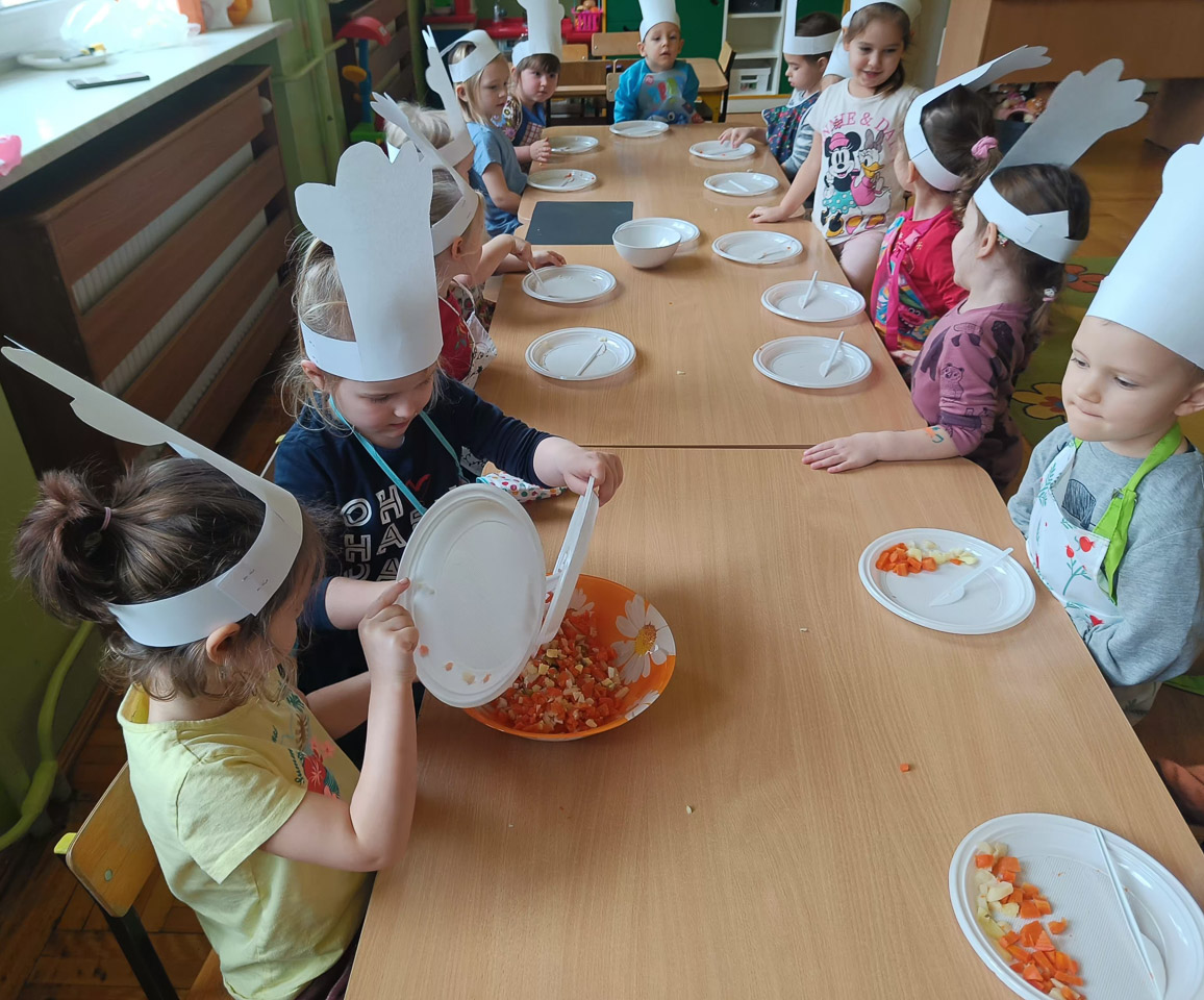 Dziś odbiły się zajęcia warsztatowe i wspólnie zrobiliśmy sałatkę jarzynową, dzieci uzbrojone w plastikowe nożyki i talerzyki przystąpiły do samodzielnego krojenia warzyw, mieszania i oczywiście wspólnej degustacji.