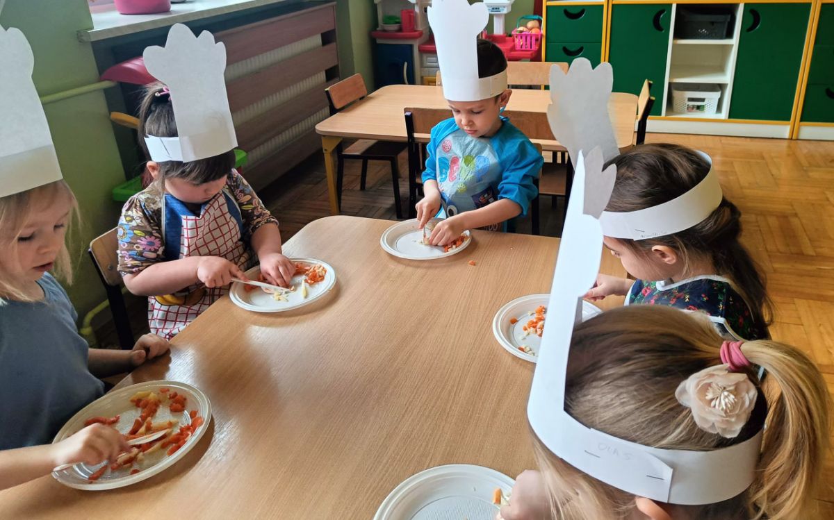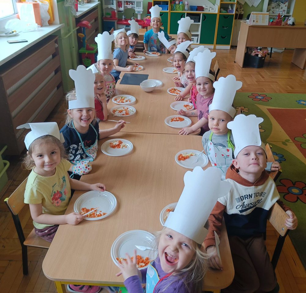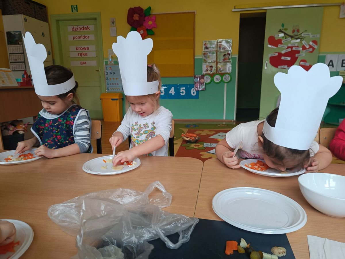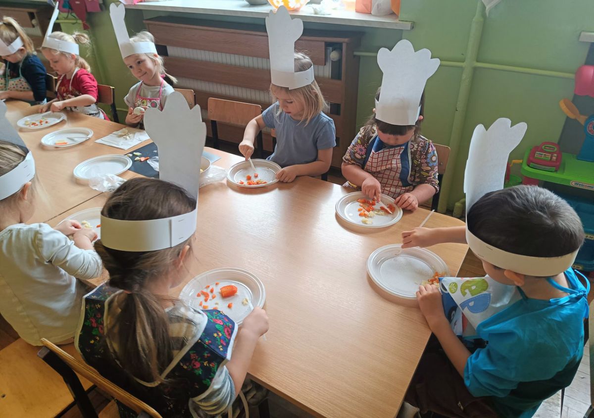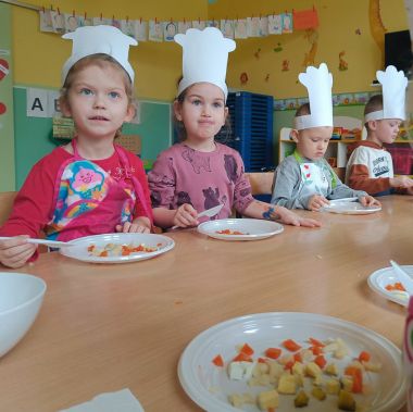 Dziś odbiły się zajęcia warsztatowe i wspólnie zrobiliśmy sałatkę jarzynową, dzieci uzbrojone w plastikowe nożyki i talerzyki przystąpiły do samodzielnego krojenia warzyw, mieszania i oczywiście wspólnej degustacji.