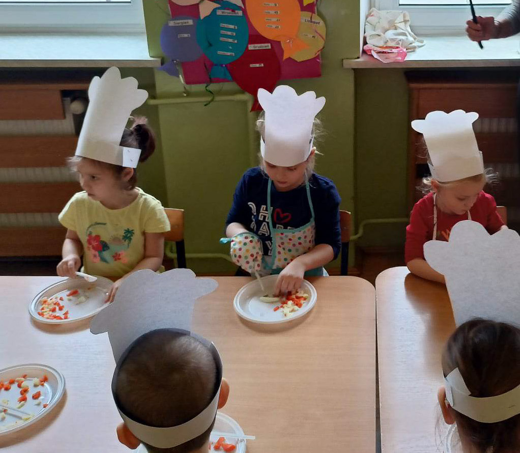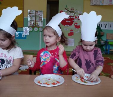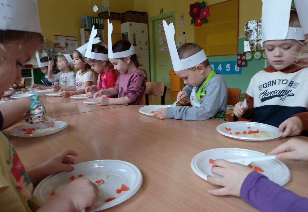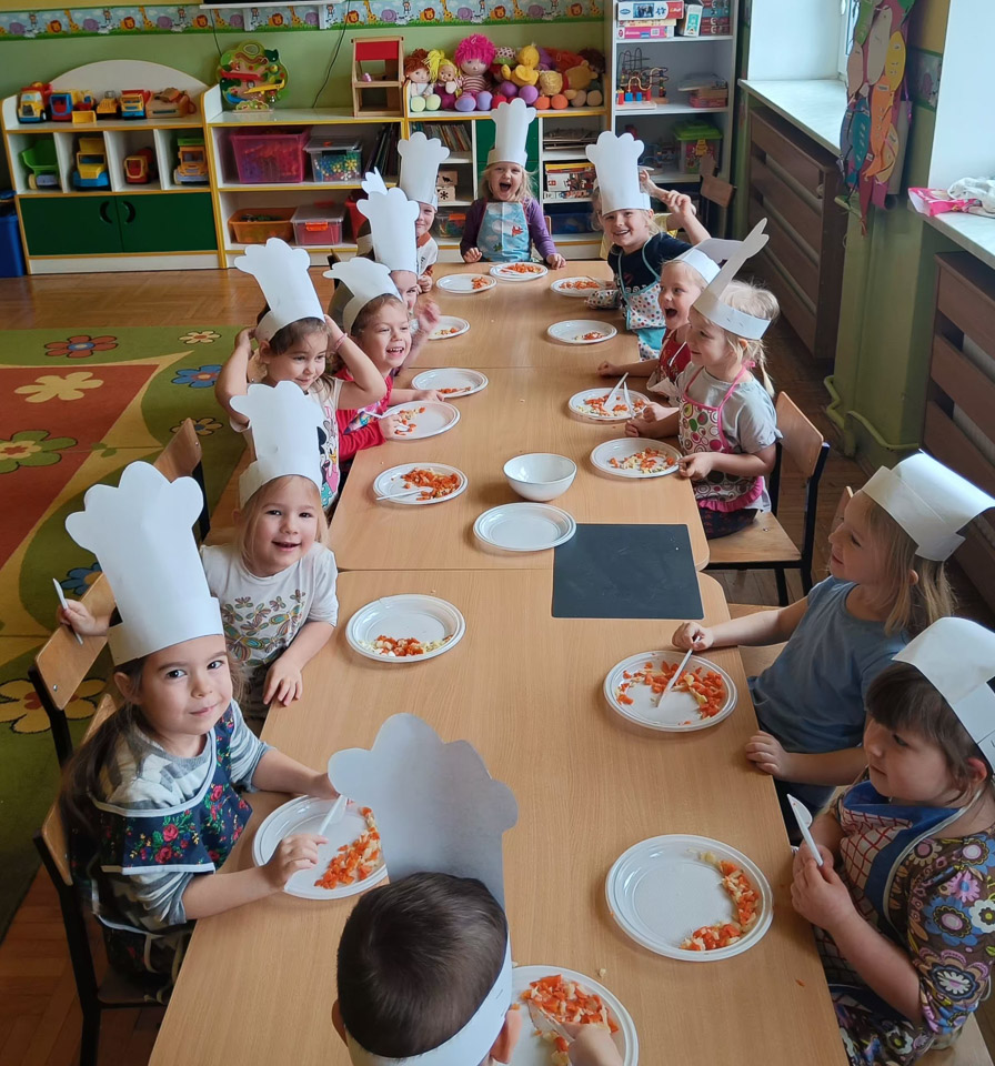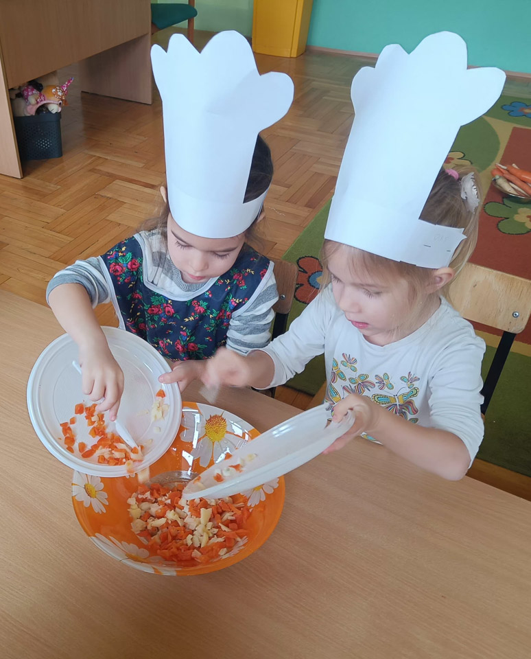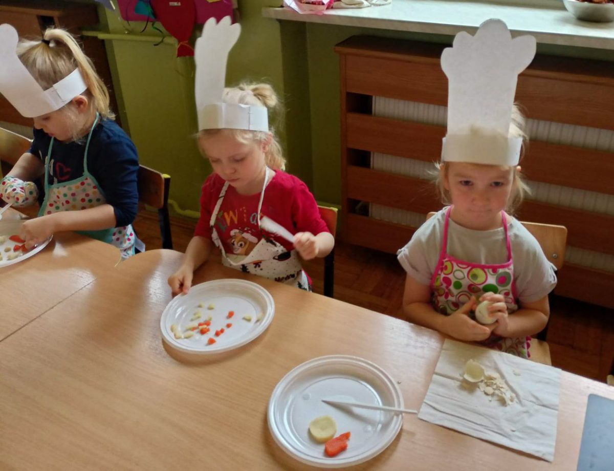 Dziś odbiły się zajęcia warsztatowe i wspólnie zrobiliśmy sałatkę jarzynową, dzieci uzbrojone w plastikowe nożyki i talerzyki przystąpiły do samodzielnego krojenia warzyw, mieszania i oczywiście wspólnej degustacji.