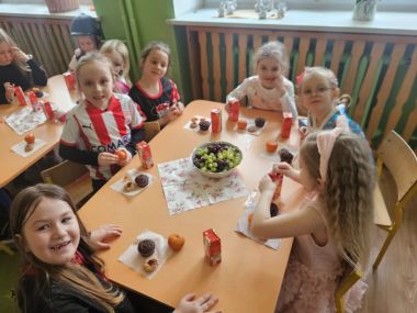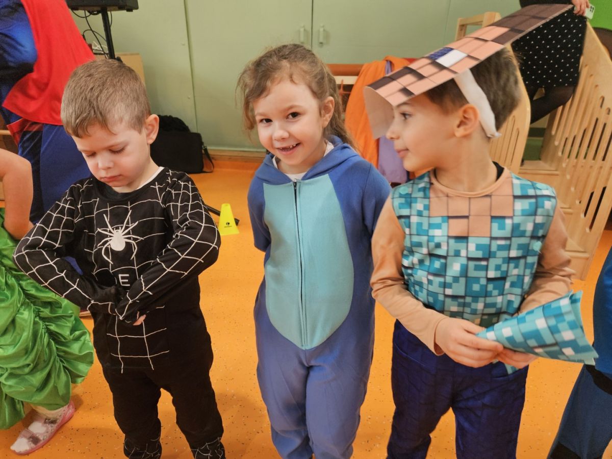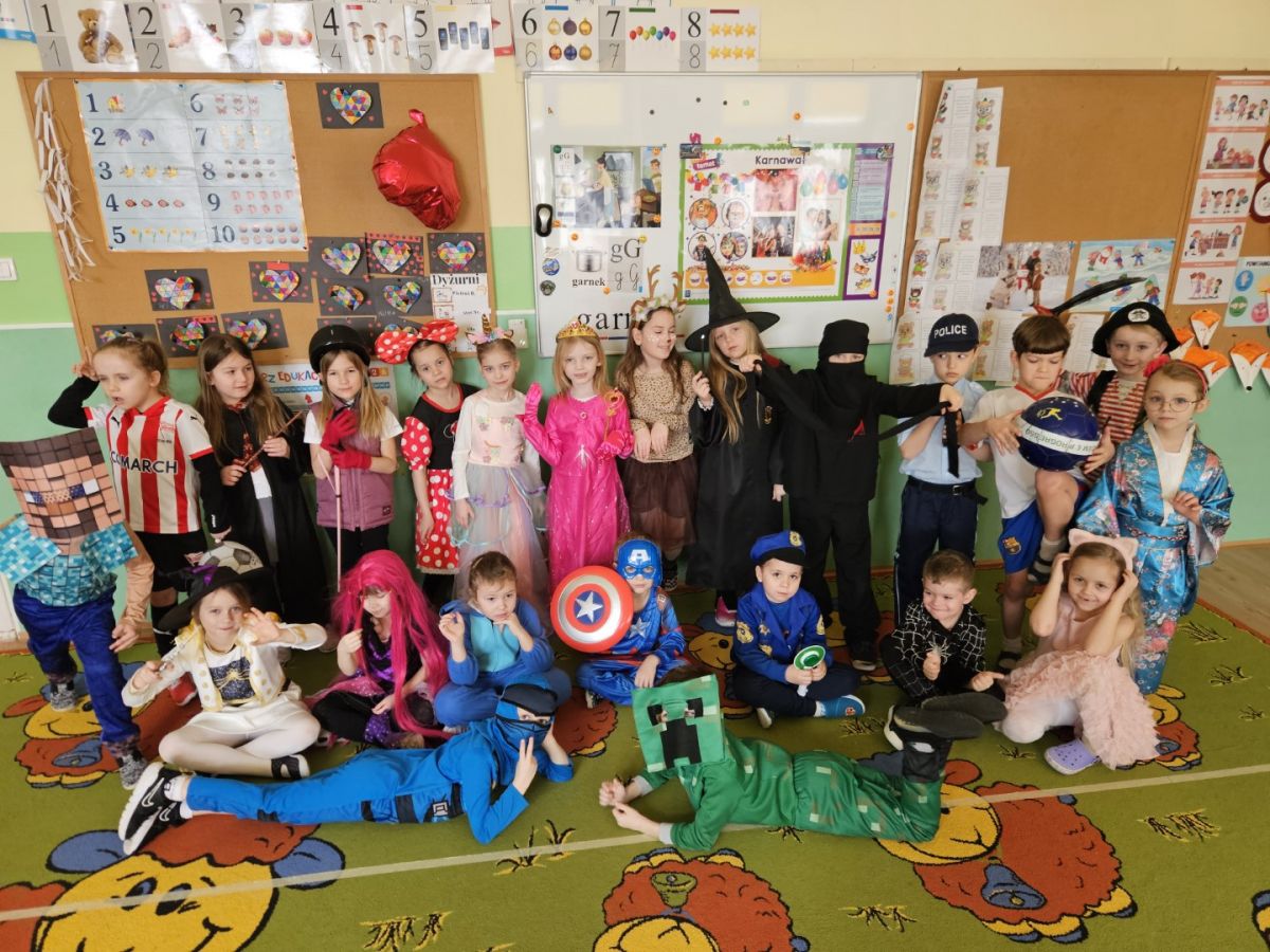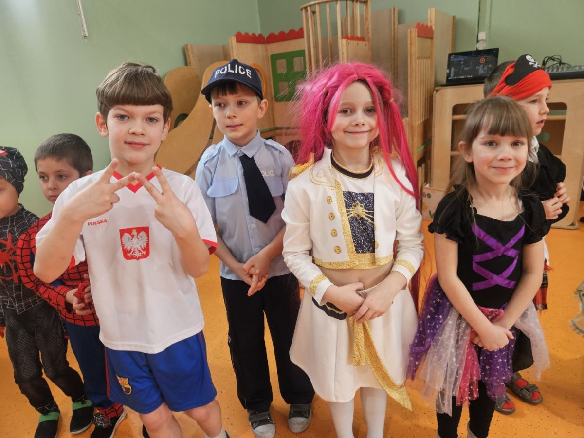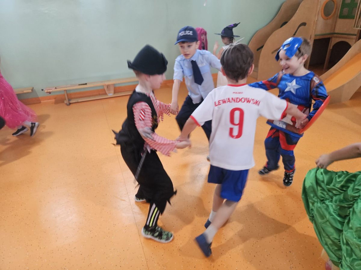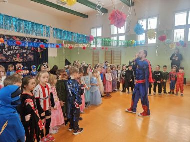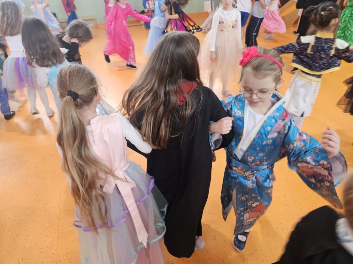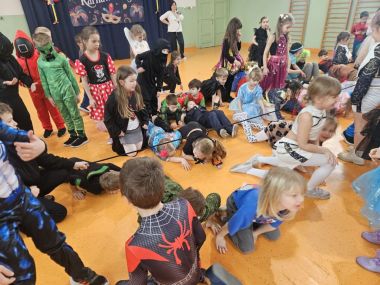 Dzieci wzięły udział w balu karnawałowym i świetnie się bawiły. Każdy uczestnik przebrał się w swój ulubiony strój, co stworzyło kolorową i radosną atmosferę. Rodzice przygotowali smaczny poczęstunek, za który serdecznie dziękujemy. Muzyka była głośna, ale zabawa znakomita i bardzo podobała się dzieciom.