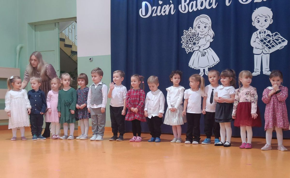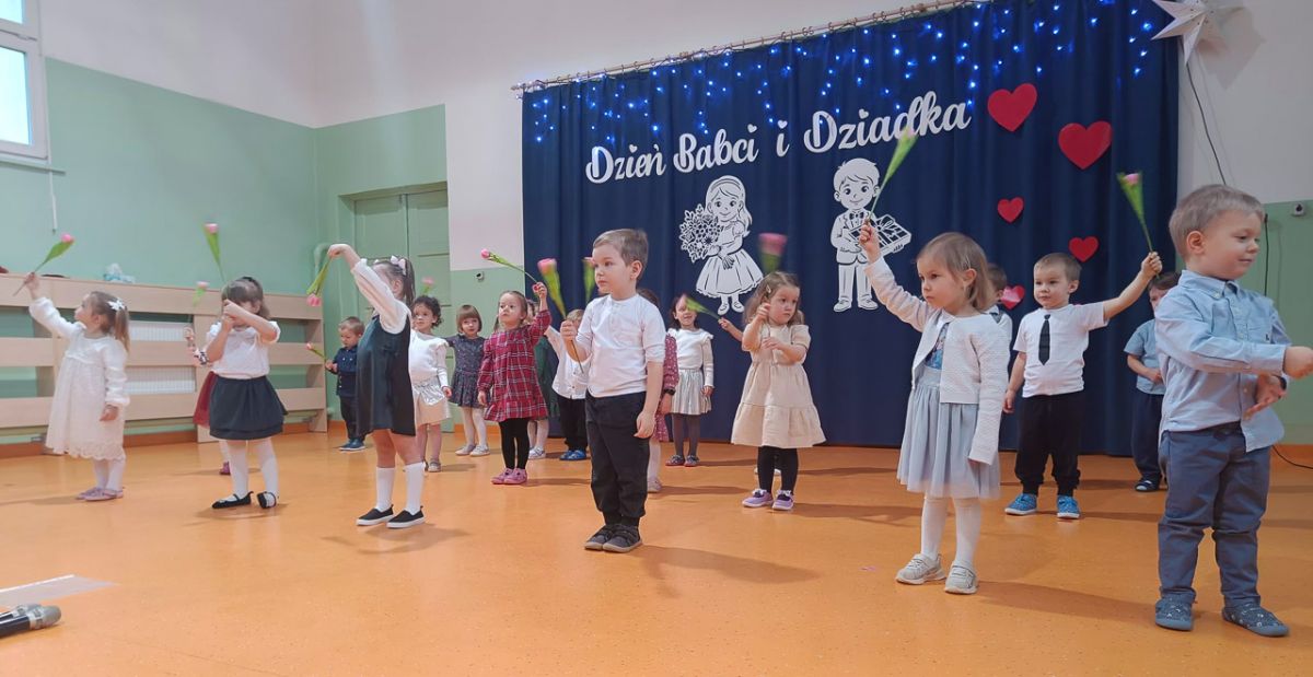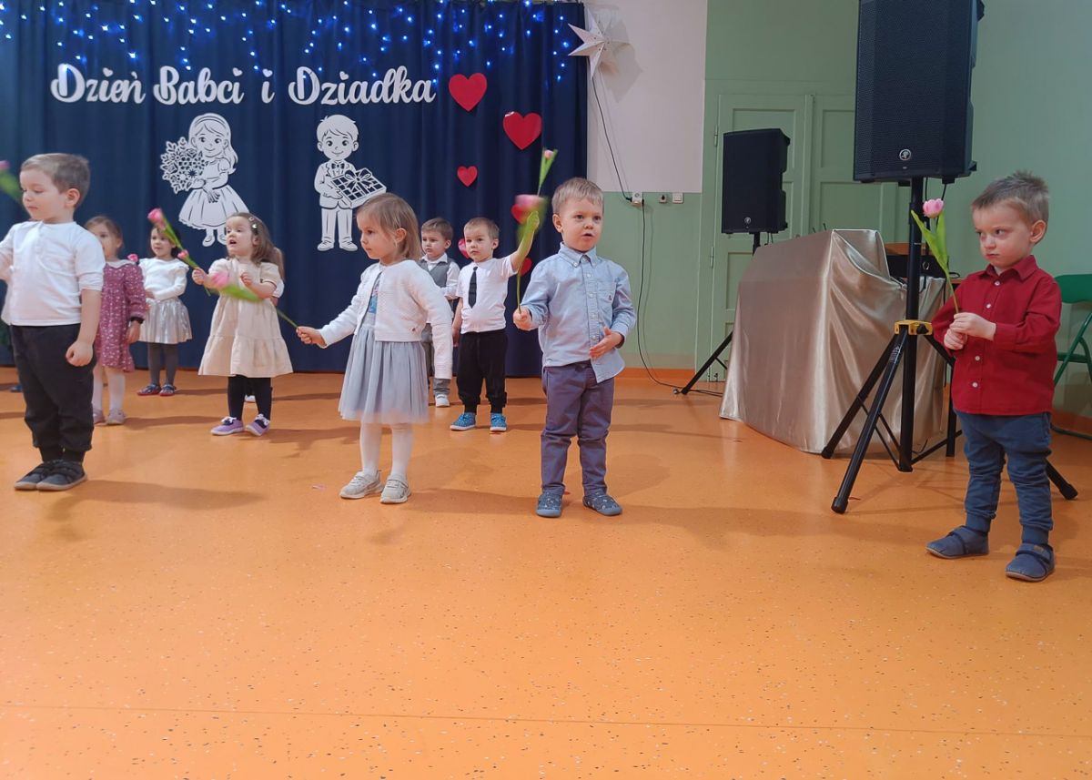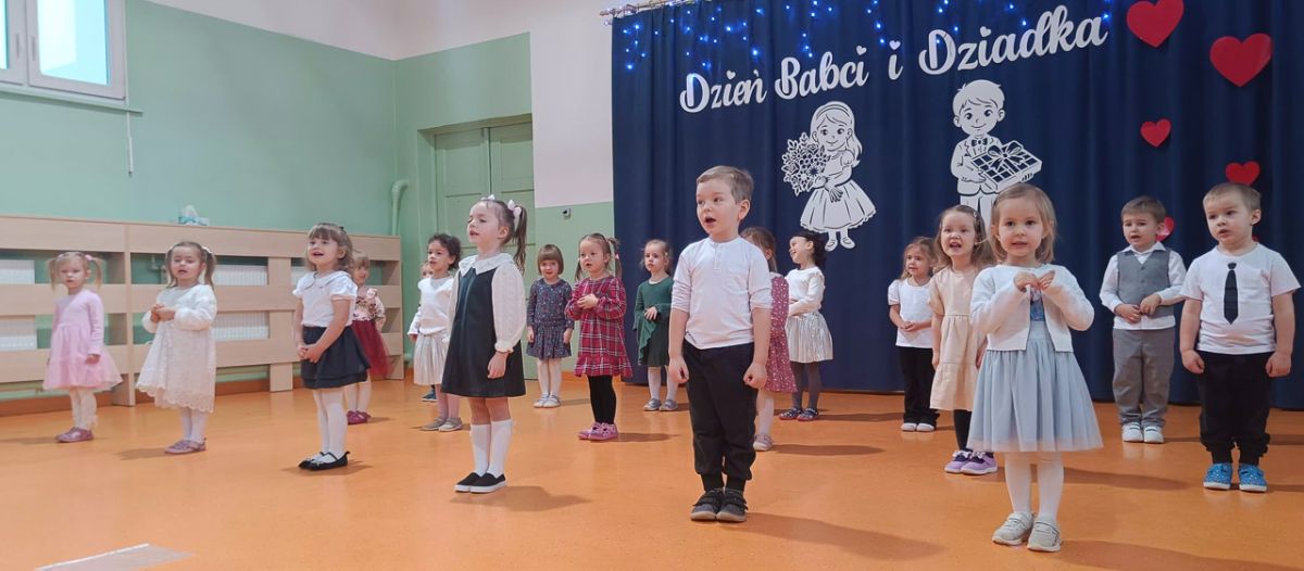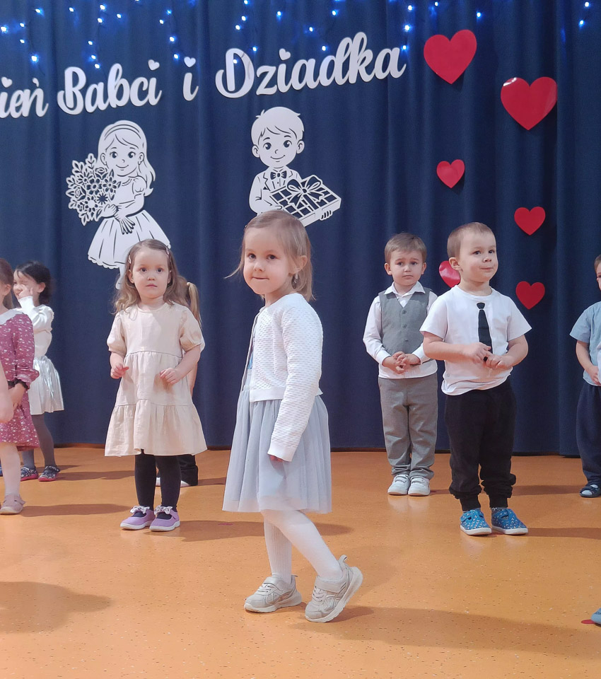 Grupa najmłodsza, trzylatków, z wielkim zaangażowaniem przygotowała piękny występ dla Babć i Dziadków z okazji ich święta. Dzieci zaprezentowały urocze piosenki i wierszyki, wkładając w nie całe swoje serduszka. Choć było to dla nich duże przeżycie, mali artyści wykazali się ogromną odwagą i radością ze wspólnego występu.
