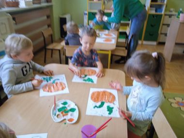 31 października obchodziliśmy "Dzień dyni". Dzieci dowiedziały się, że dynia jest bardzo zdrowym owocem i można z niej przygotować wiele potraw. Wzięły udział w licznych zabawach ruchowych z dynią. Świetnie bawiły się przy piosenkach i wyliczankach z dynią w roli głównej.