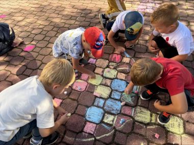 Przedszkolaki uczestniczyły w różnorodnych zajęciach ruchowych, rytmicznych i plastycznych z motywem kropki. Dzieci brały także udział w doświadczeniach z olejem i zabarwionym mlekiem. Stworzyły kolorowe prace - na chodniku przed przedszkolem i na papierze, a przy tym przekonały się, że nawet od jednej małej kropki może zacząć się wielka przygoda z wyobraźnią.