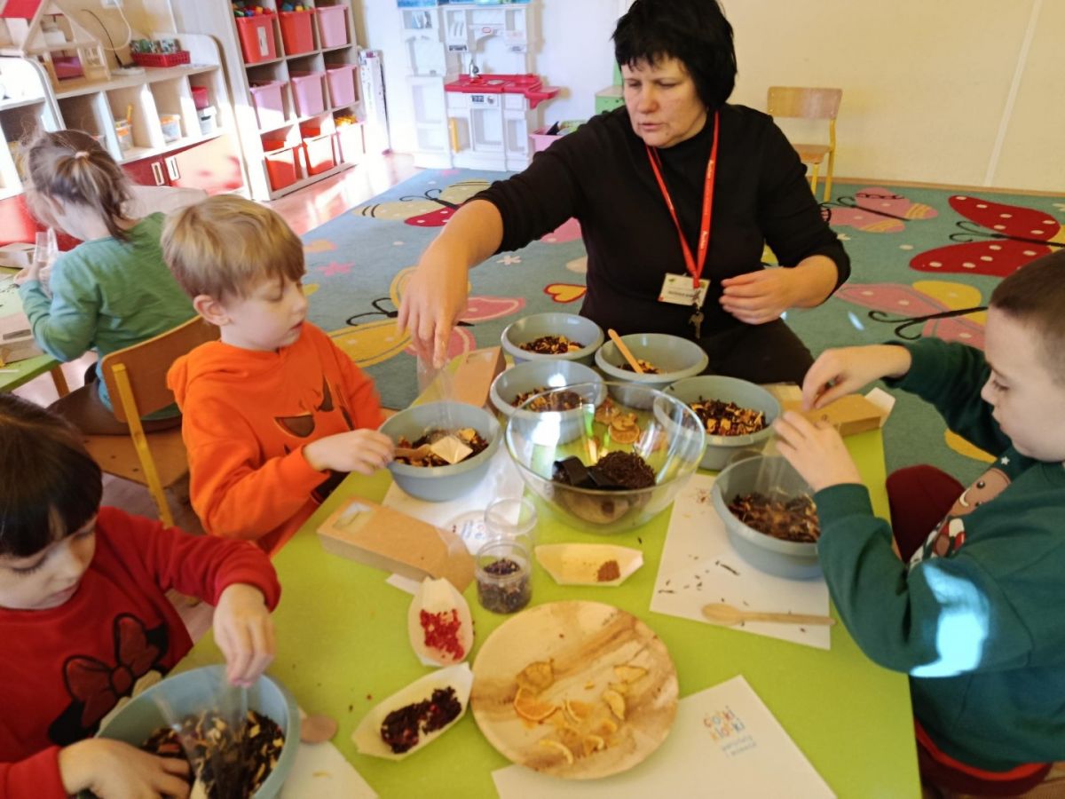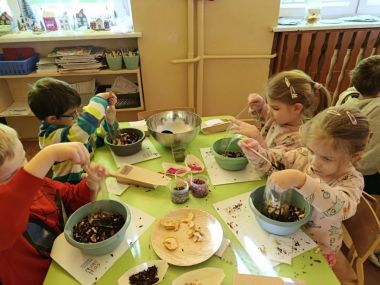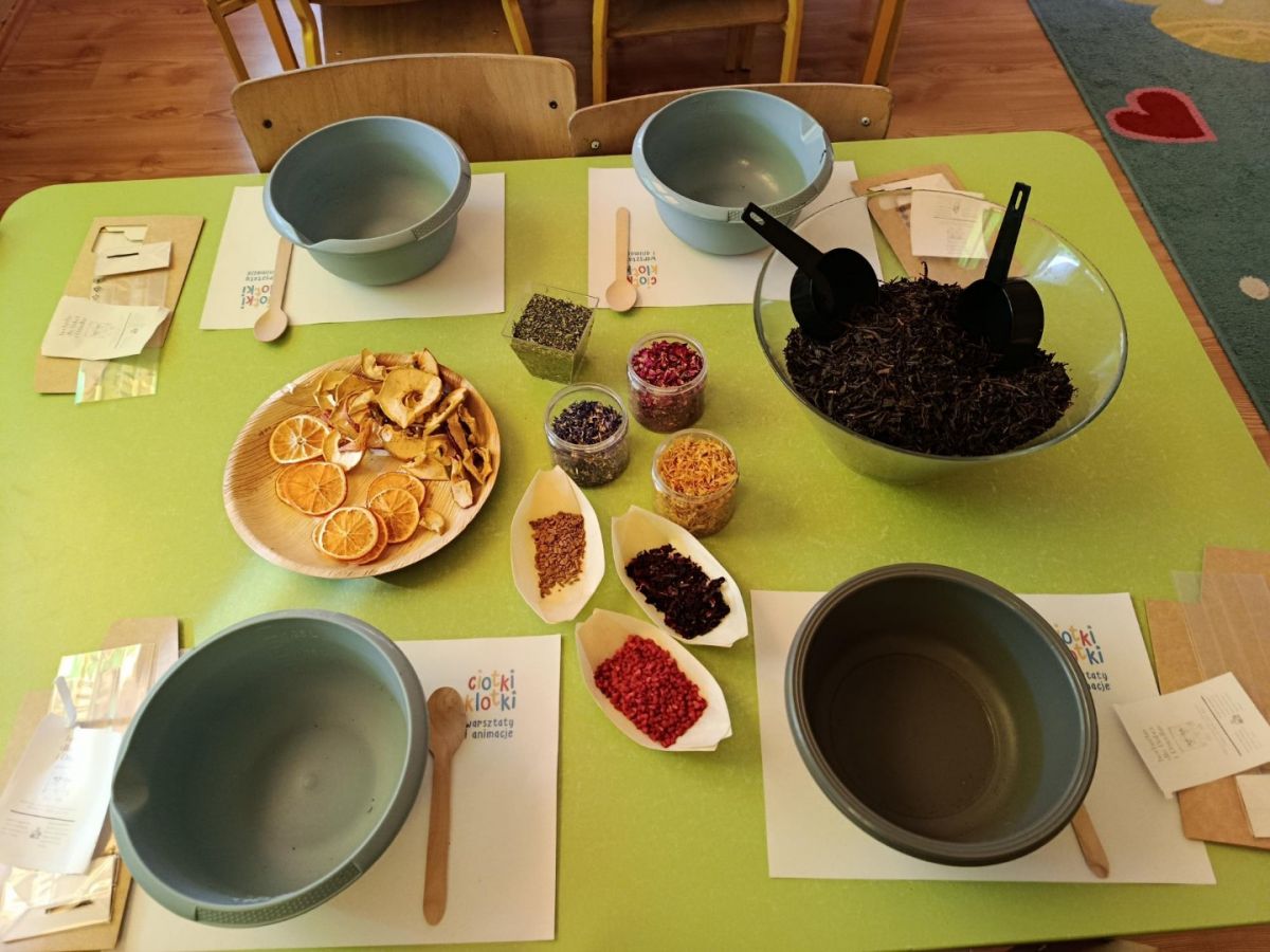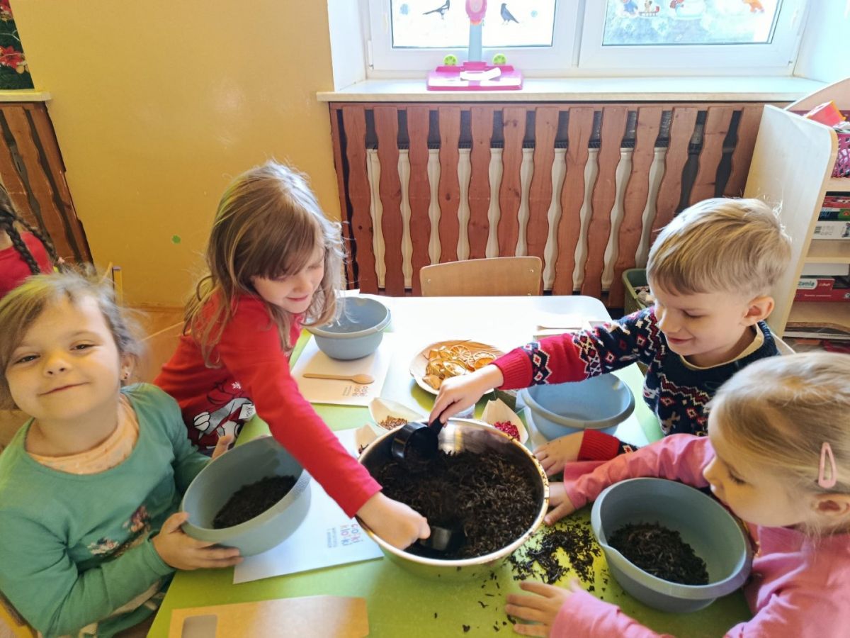 Na warsztatach herbacianych dowiedzieliśmy się skąd pochodzi herbata, poznaliśmy różne gatunki herbat, degustowaliśmy kwitnącą herbatę oraz własnoręcznie zrobiliśmy herbaty dla babci i dziadka z suszonych ziół, kwiatów i owoców.