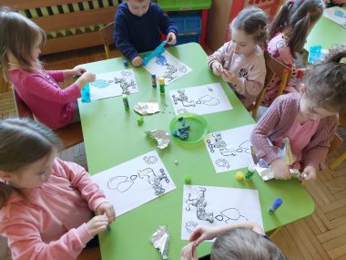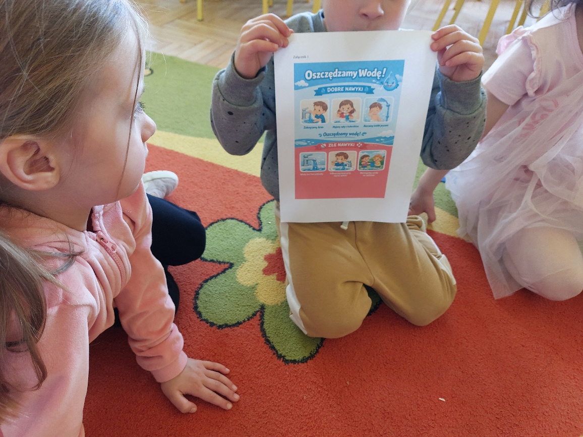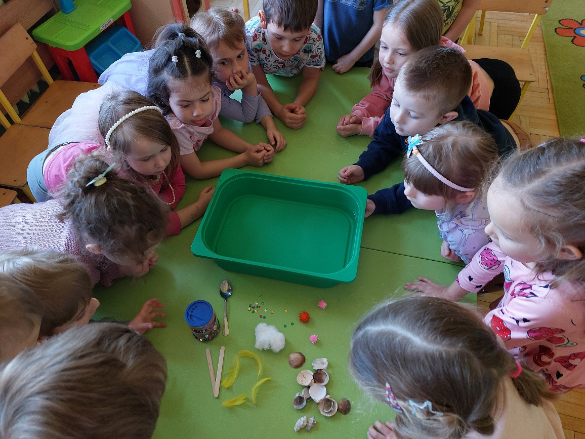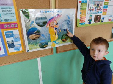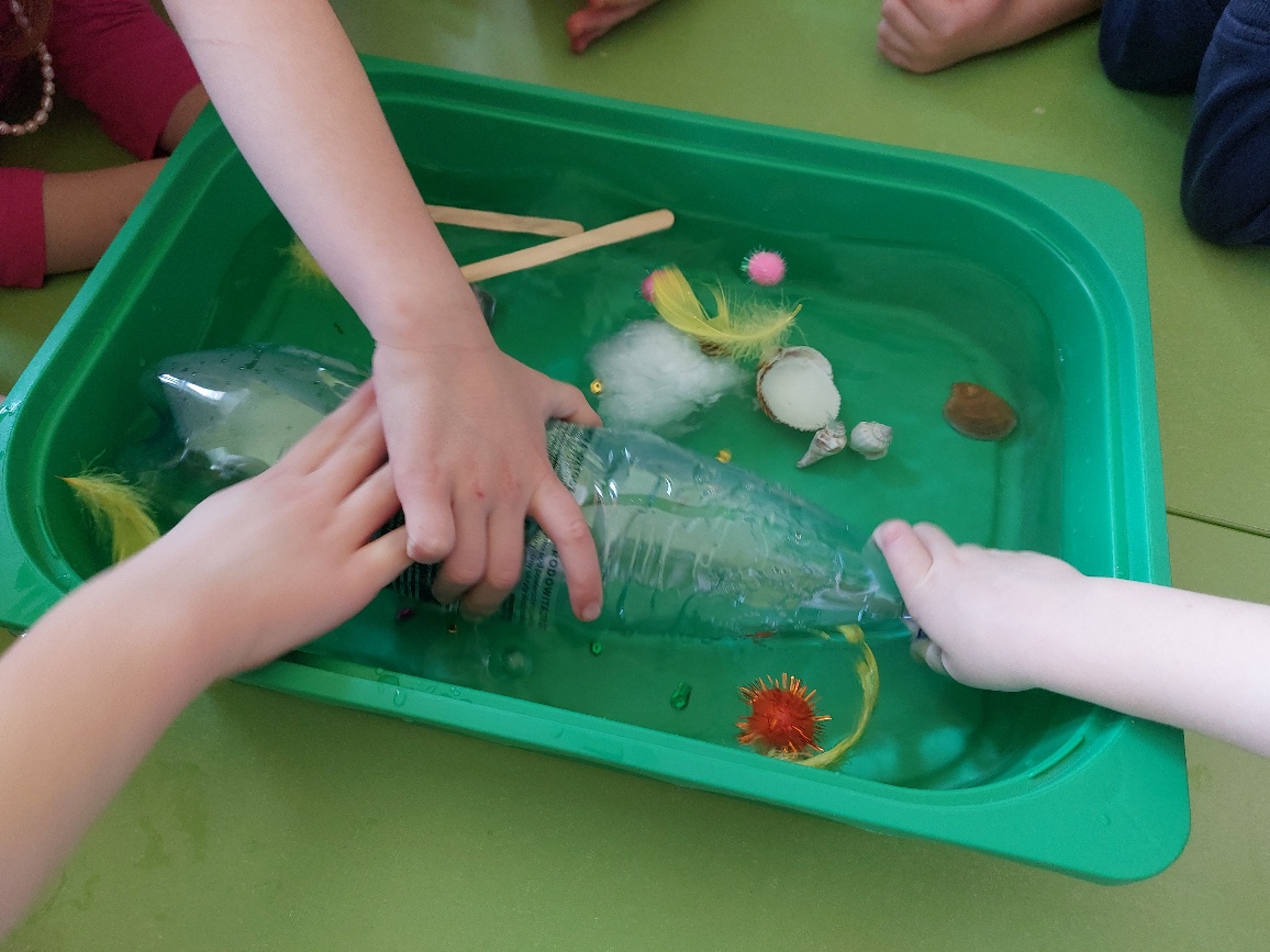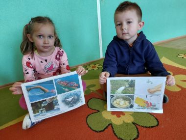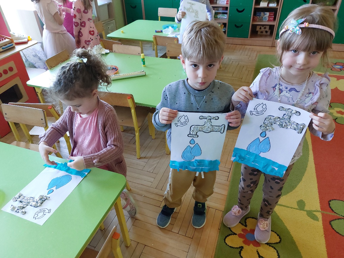 Dzieci wykonały kolejne zadanie z projektu "Z przyrodą za pan brat" o tematyce wody. Przeprowadziliśmy kilka doświadczeń, dowiedzieliśmy się co pływa, a co tonie. Dzieci opowiadały jak powstaje deszcz, jak potrzebna jest woda, gdzie ją wykorzystujemy, jak jest ważna nie tylko dla ludzi, ale również dla zwierząt i roślin. Na koniec wykonały pracę plastyczną, ktora była dopełnieniem naszych zajęć.