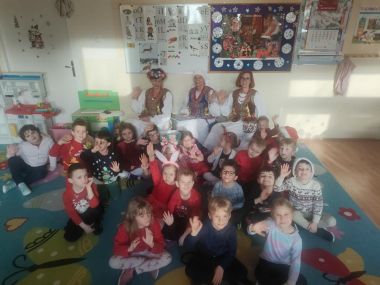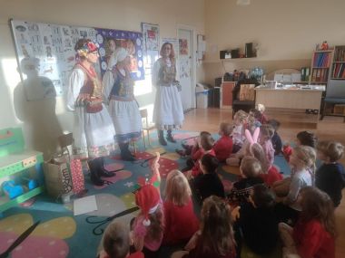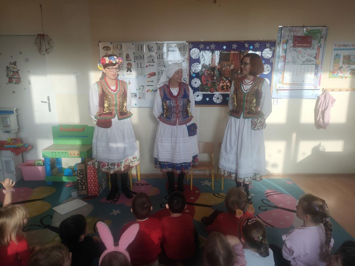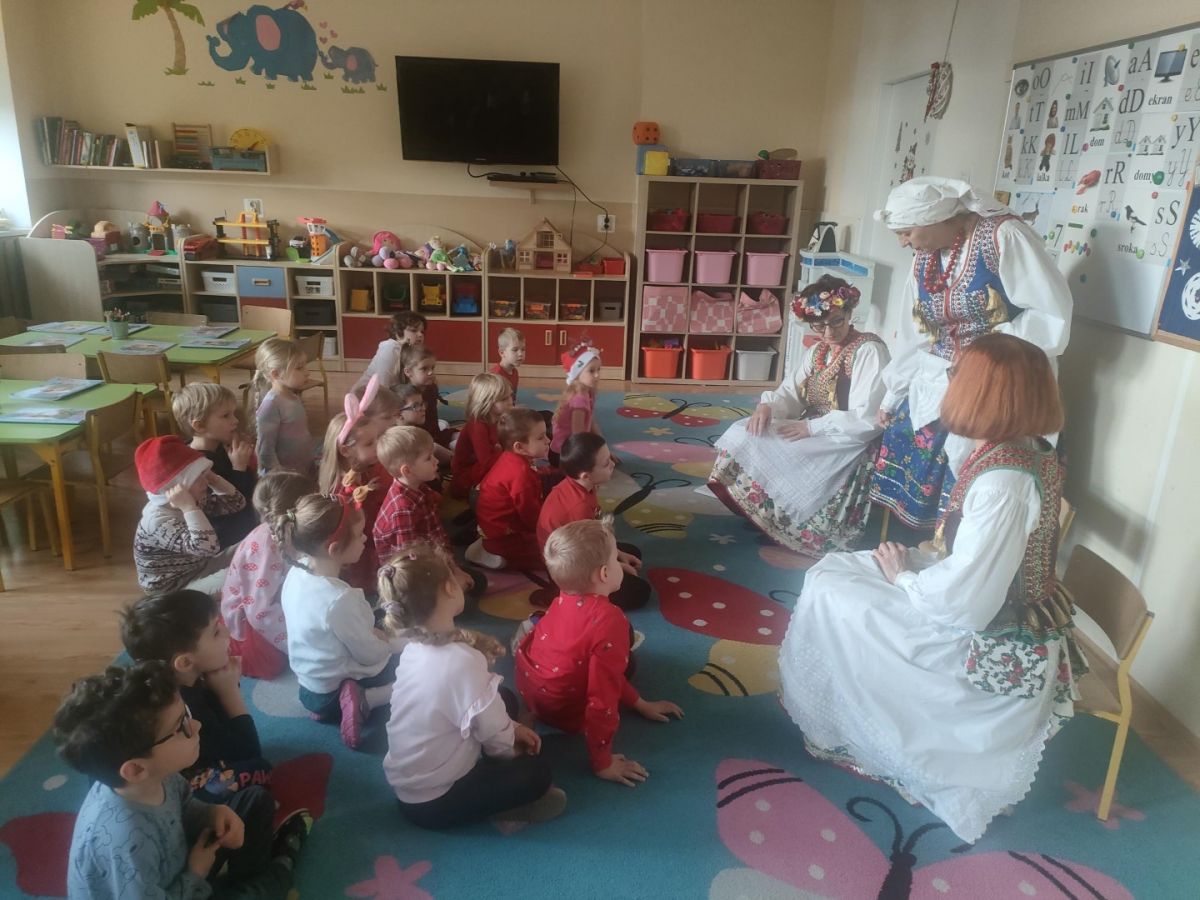 Panie opowiadały o elementach stroju krakowskiego, dzieci odszukiwały różnice w strojach, poznały kroki Krakowiaka, wykonały taniec do ludowych piosenek, poznały zwyczaje bożonarodzeniowe z Węgrzc, zakończeniem spotkania było ozdabianie cekinami gorsetu krakowianki. Bardzo dziękujemy za miłą współpracę.