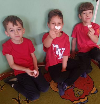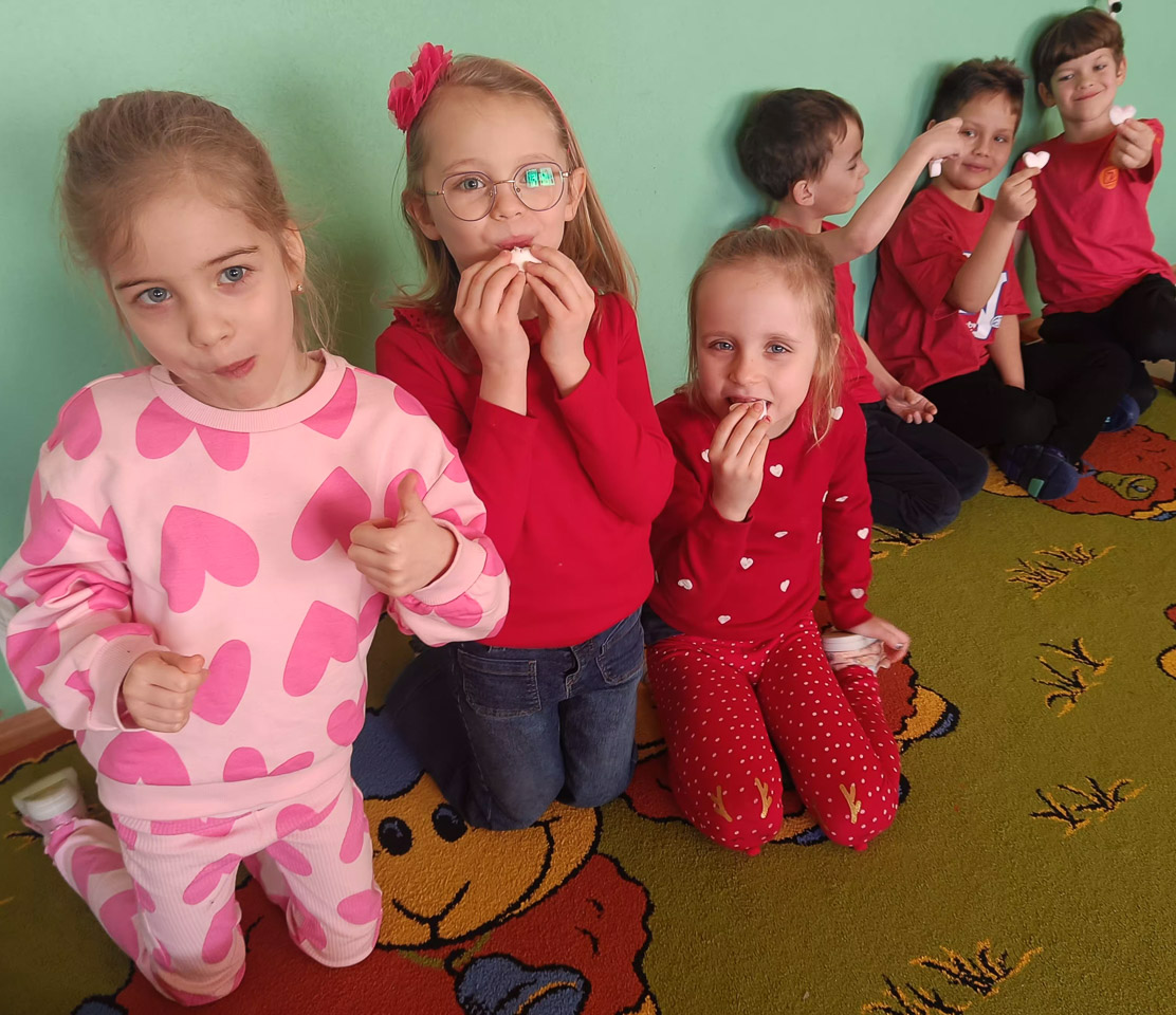 Grupa VI obchodziła Walentynki w kolorach miłości. Dzieci poznały legendę o św. Walentym, stworzyły kolorowe serca, ćwicząc motorykę małą – kolorowały, wycinały i naklejały. Rozmawialiśmy także o miłości. Rodzice przygotowali dla nich słodkie, pachnące truskawkami pianki marshmallow w kształcie serca, za co bardzo dziękujemy. ❤️