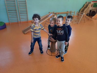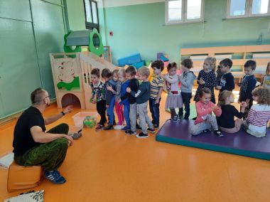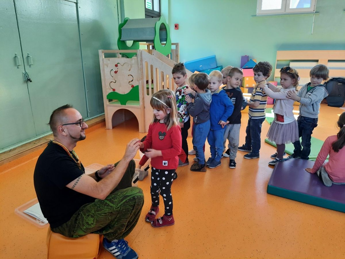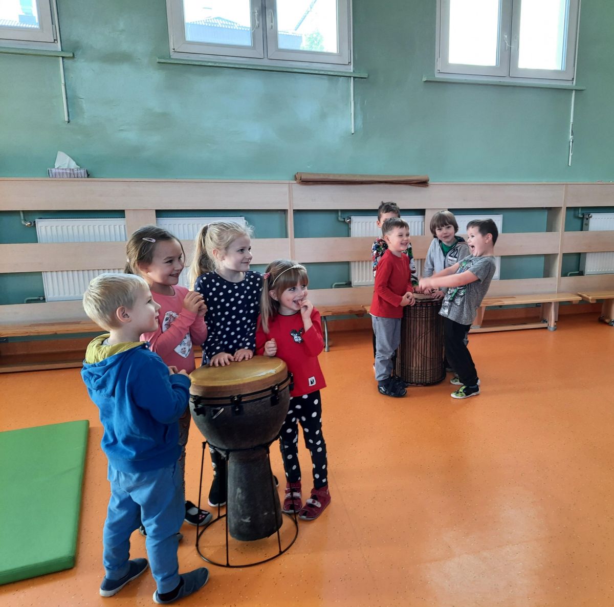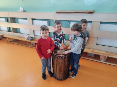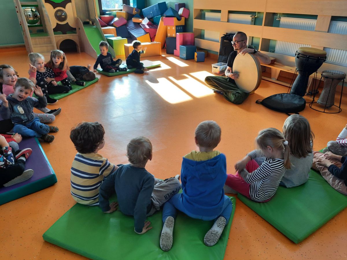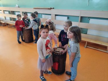 Przedszkolaki dzięki warsztatom poznały historię bębnów, nauczyły się wydobywać z nich dźwięki, które można nie tylko usłyszeć , ale i poczuć całym ciałem. Stworzyły wspólny bębniarski zespół i narobiły duuuuużego hałasu. Na koniec dostały dyplom za udział w zajęciach oraz zrobiły własne grzechotki, które powędrowały z nimi do domu.