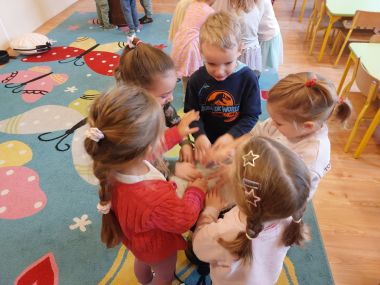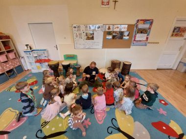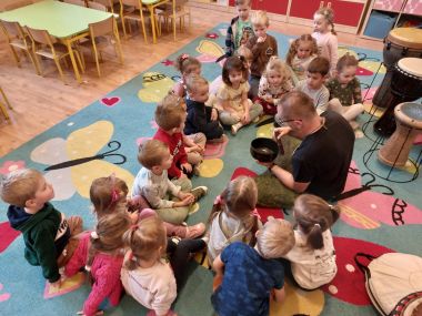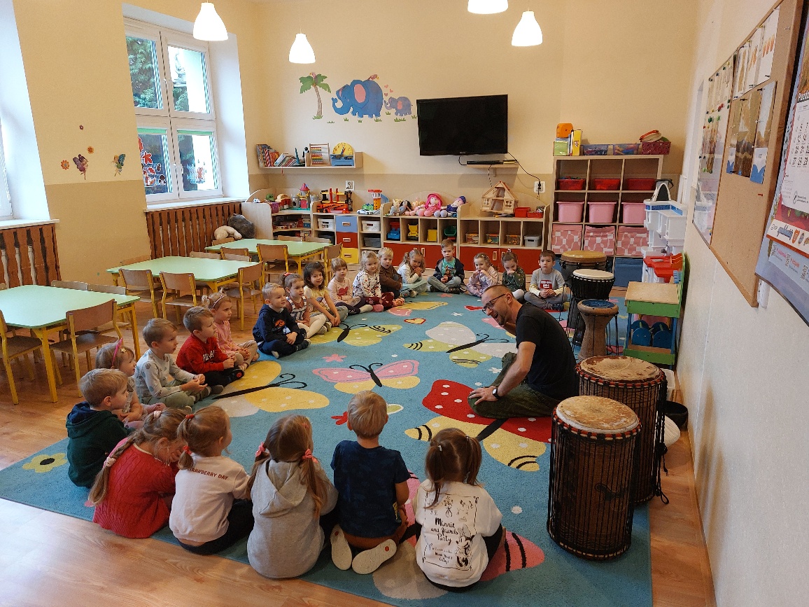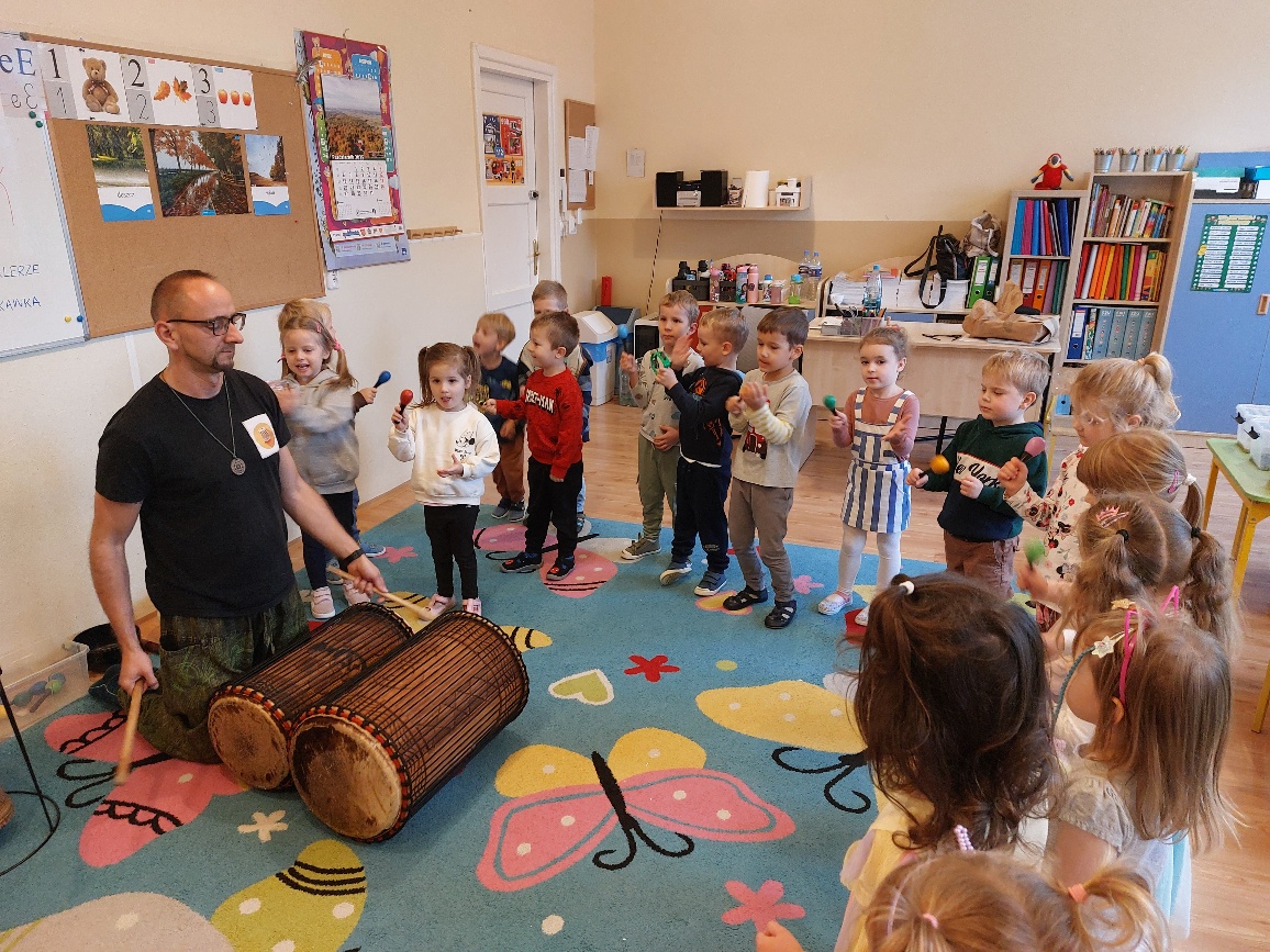 22 października w naszej grupie odbyły się warsztaty bębniarskie. Dzieci miały okazję zagrać na prawdziwych bębnach, uczyć się prostych rytmów, wspólnego grania, a nawet tańczenia. Na koniec zrobiły własne grzechotki, dzięki którym tworzyły własny mini koncert.