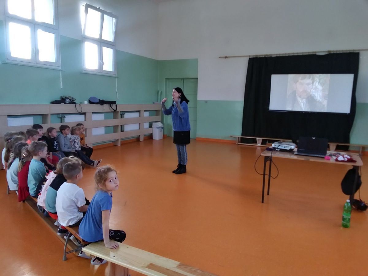 10 października 2022r w naszej grupie odbyły się warsztaty historyczne podczas których dzieci poznały postać Stanisława Wyspiańskiego. Warsztaty te odbyły się w ramach Tygodnia Kultury Ludowej, który trwa w całym przedszkolu (całej gminie) od dziś do piątku. Dzieciaczki bardzo uważnie słuchały opowiadania p. Inez, z zaciekawieniem oglądały prezentowane przy wykorzystaniu rzutnika zdjęcia oraz bardzo chętnie przebierały się w elementy strojów krakowskich. Dzieci były bardzo uważne, śmiało zadawały p. Inez pytania i z ochotą wykonały portret Stanisława Wyspiańskiego jako zwieńczenie warsztatów.