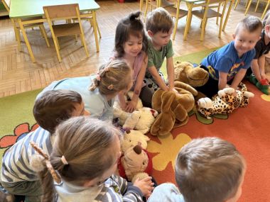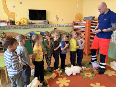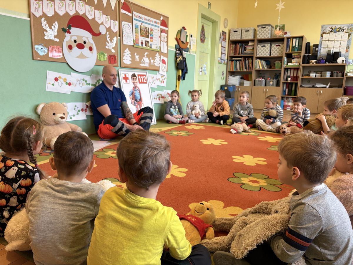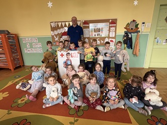 Dzieci z naszej grupy miały przyjemność uczestniczyć w warsztatach z pierwszej pomocy. Były to tym bardziej atrakcyjne zajęcia, iż prowadzone przez tatę Maciusia. Podczas nich dzieci dowiedziały się, czym jest pierwsza pomoc, jak rozpoznać niebezpieczeństwo, kiedy i jak wezwać pomoc oraz jak udzielić wsparcia poszkodowanym – wszystko w dostosowanej do wieku, bezpiecznej i angażującej formie. Przedszkolaki same wcieliły się w rolę dzielnych ratowników, bowiem udzielały pomocy swoim misiom, które przyniosły z domu. Były to bardzo pouczające zajęcia, które na długo pozostaną w naszej pamięci.
