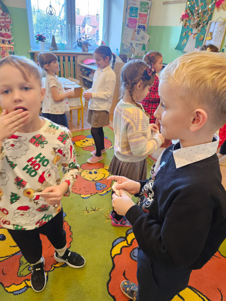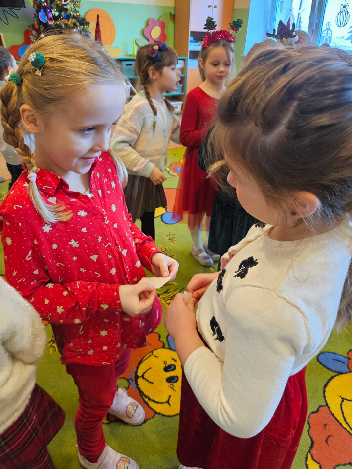 18 grudnia w Grupie VI odbyło się wyjątkowe spotkanie wigilijne. Dzieci wspólnie łamały się opłatkiem, składając sobie serdeczne życzenia. Na stołach pojawił się przepyszny poczęstunek przygotowany przez Rodziców, za co serdecznie dziękujemy. Towarzyszyło nam wspólne kolędowanie, miła i ciepła atmosfera oraz eleganckie, świąteczne stroje. Były to cudowne, pełne radości i magii świąt chwile, które na długo pozostaną w naszej pamięci.