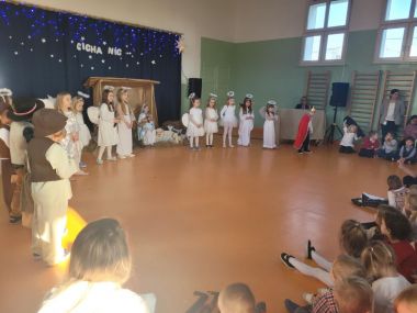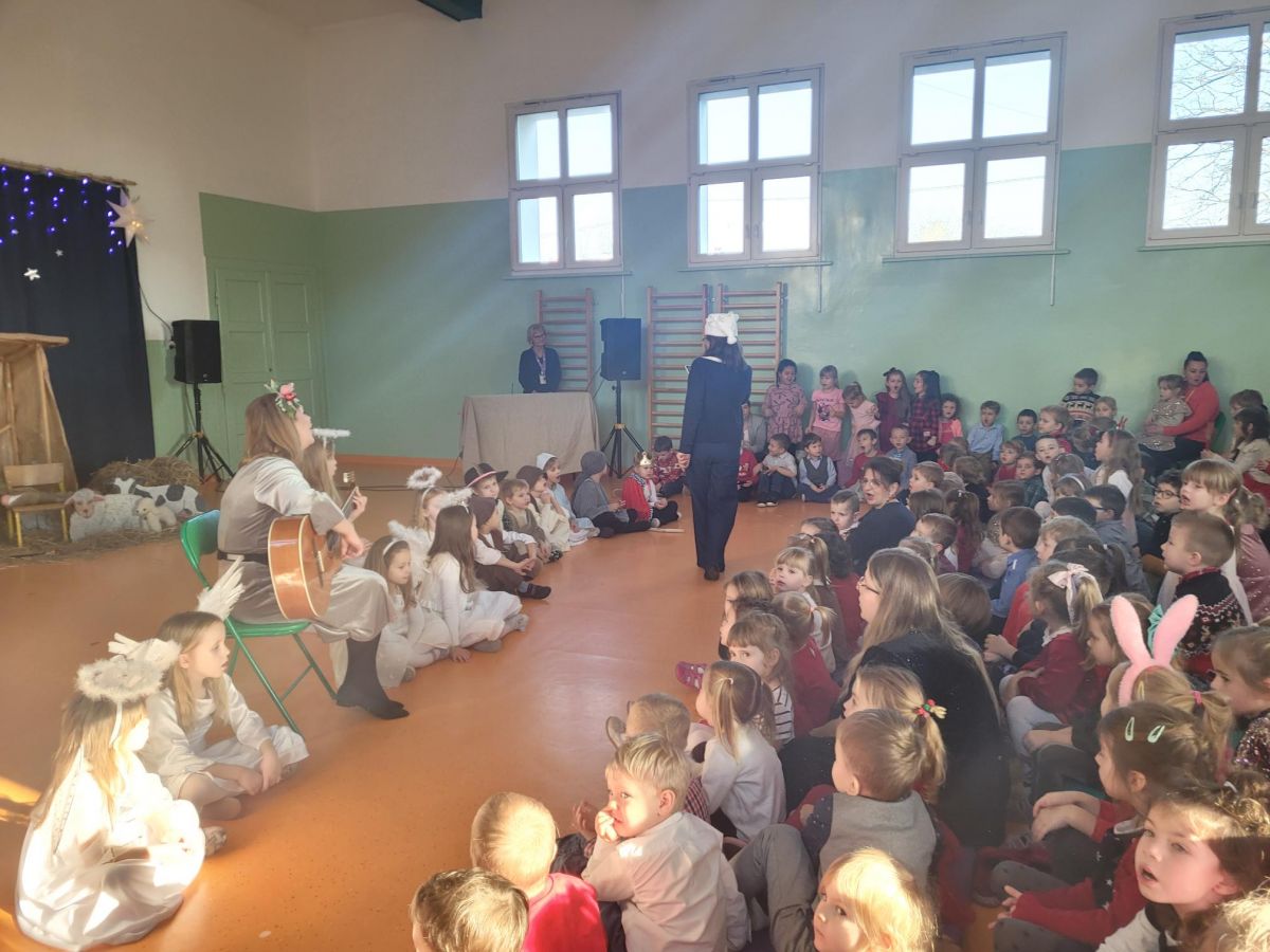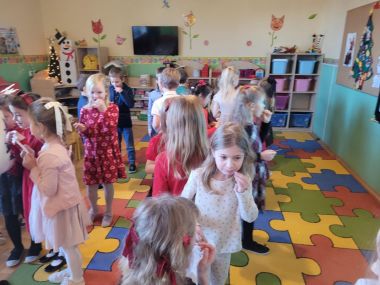 W piątek 19 grudnia przedszkolaki świętowały Wigilię, przygotowaną przez Rodziców. Dzieci podzieliły się opłatkiem składając sobie świąteczne życzenia, po czym zasiadły wspólnie do stołu. Po Wigilii uczestniczyły w przedstawieniu Jasełkowym w wykonaniu dzieci z grupy VI, na zakończenie wszyscy przy akompaniamencie gitary wspólnie z Panią Madzią pięknie zaśpiewali kolędy i pastorałki świąteczne.