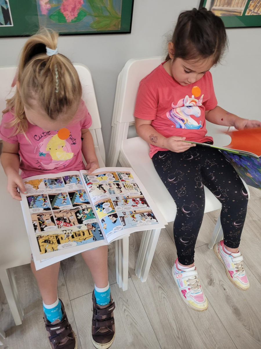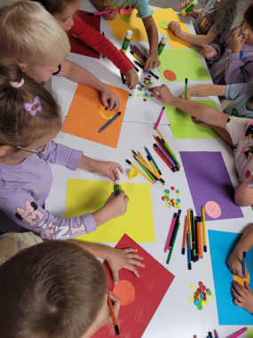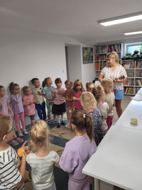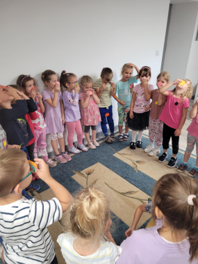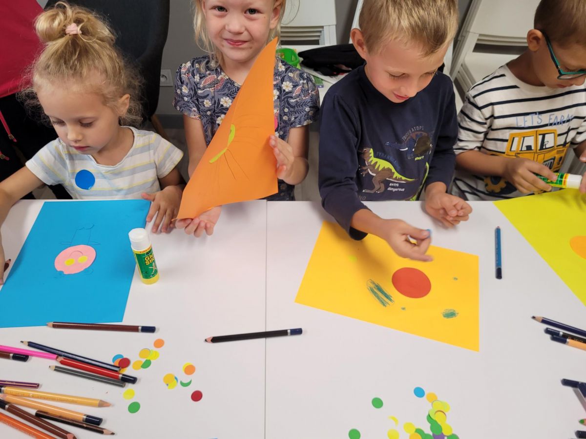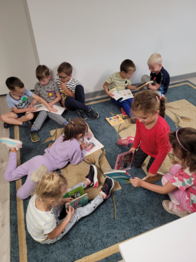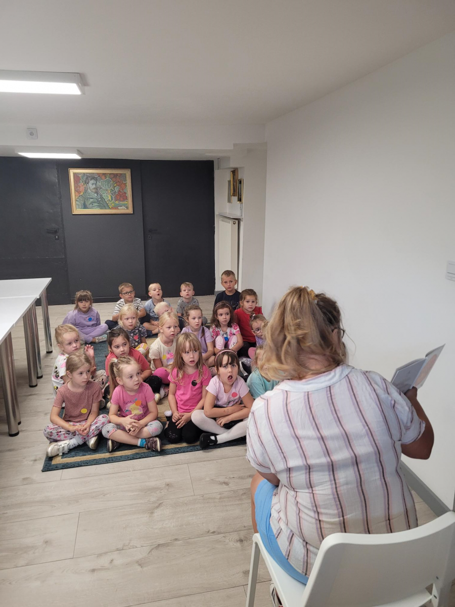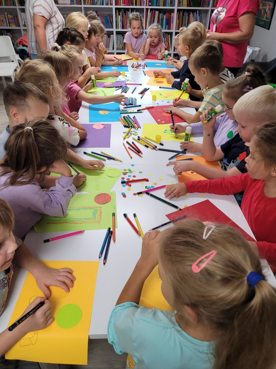 Przywitała nas Pani Madzia bibliotekarka, która pokazała dzieciom jak wygląda biblioteka, opowiedziała o swojej pracy oraz jak trzeba się zachować w tym miejscu. Z okazji zbliżającego się Dnia Kropki dzieci wysłuchały czytanego przez Panią bibliotekarkę opowiadania o kropce, nauczyły się piosenki, którą zaśpiewały przy akompaniamencie ukulele. Na koniec dostały dużo kropek z których wykonały kolorowe kropkowe obrazki, które z radością zabrały do domu.