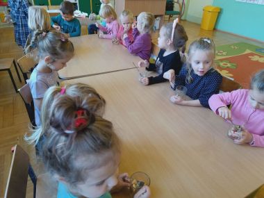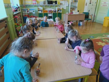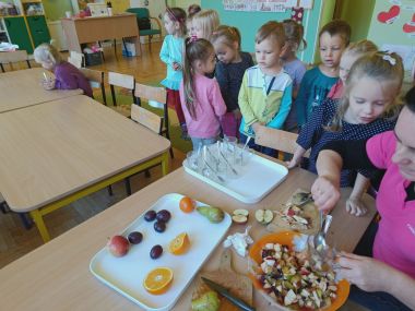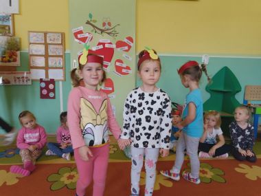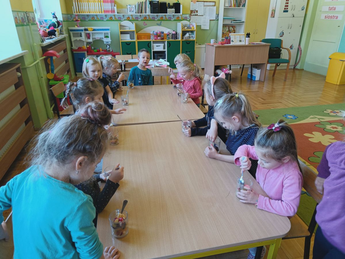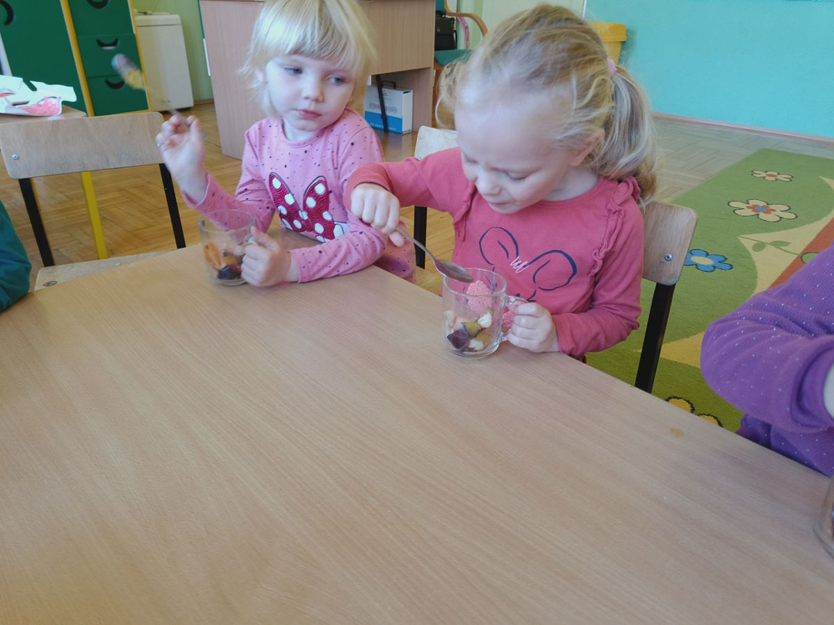 ,,Witaminki, witaminki, Dla chłopczyka i dziewczynki, Wszyscy mamy dziarskie minki, Bo zjadamy witaminki"